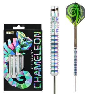 Lotki do darta One80 z serii Chameleon w wersjii steeltip. Seria Chameleon wyposażona jest w zaawansowaną powłokę tytanową PVD, która nadaje lotkom oszałamiający, trwały i metaliczny efekt tęczy. Lotki są doskonale wyważone podczas rzutu. Wykonane z wysokiej jakości wolframu VHD i z maksymalną dbałością o szczegóły.